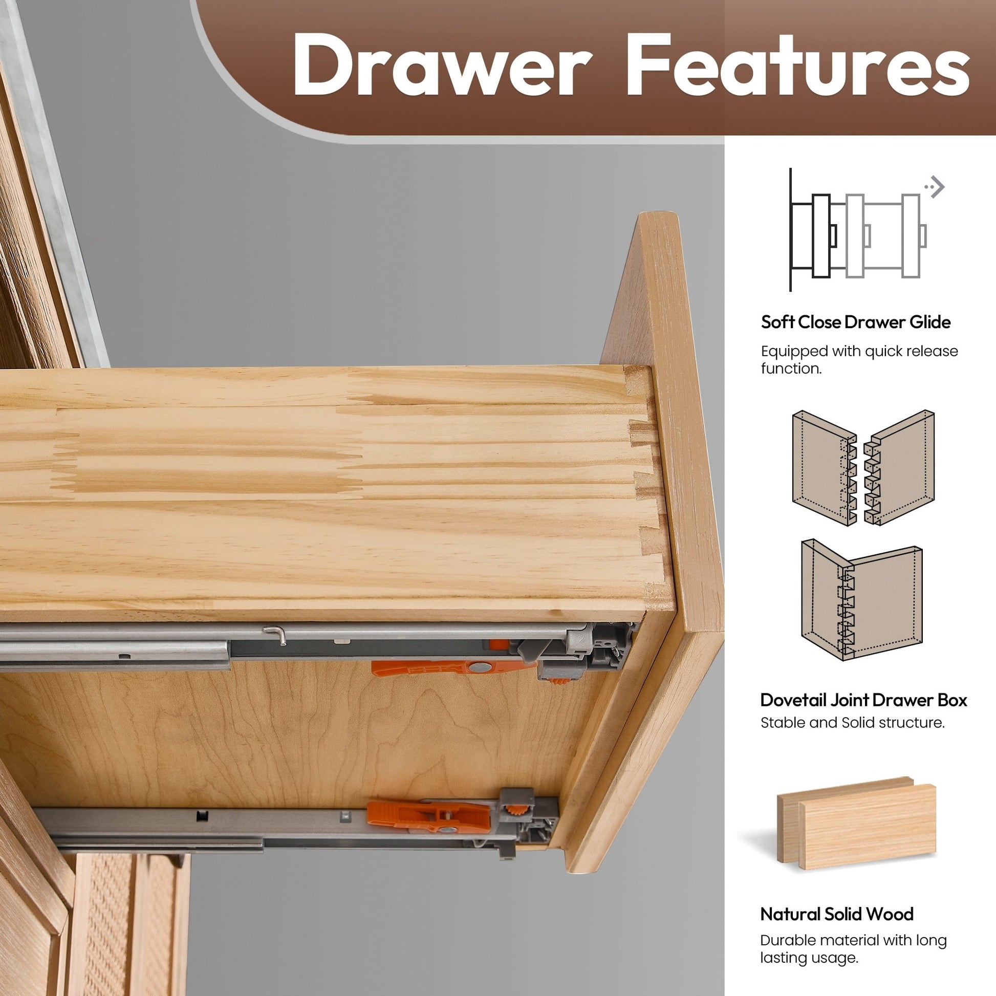 36 pouces - Une porte à fermeture en douceur avec un panneau en rotin et bambou et trois tiroirs à queue d'aronde robustes à fermeture en douceur.