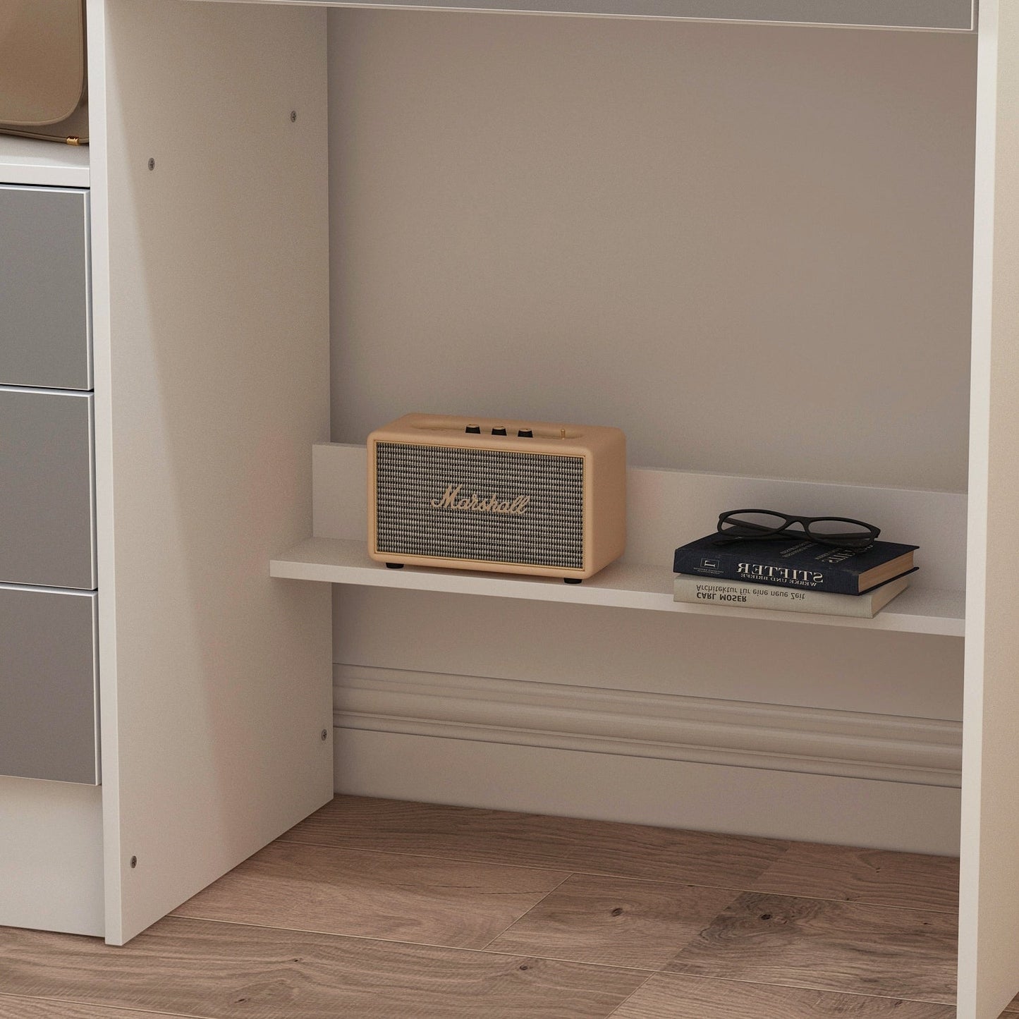 Cet ensemble coiffeuse et tabouret est conçu avec des casiers pour ranger vos cosmétiques. Cet ensemble coiffeuse et tabouret est un meuble moderne, élégant et pratique pour votre intérieur. Le grand miroir de maquillage et les 4 tiroirs offrent un espace de rangement généreux pour vos cosmétiques, parfums, lotions, vernis à ongles, accessoires pour cheveux, etc. Le tabouret rembourré est stable et confortable.