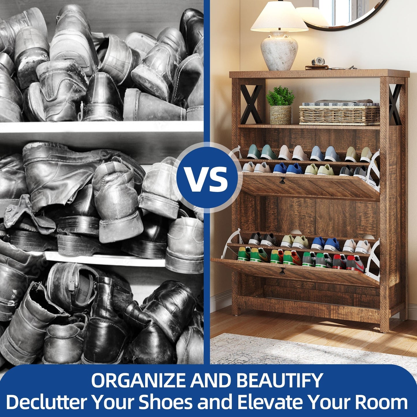- Les tiroirs à chaussures rabattables peuvent accueillir de 12 à 16 paires, les protégeant ainsi de la poussière et du désordre.