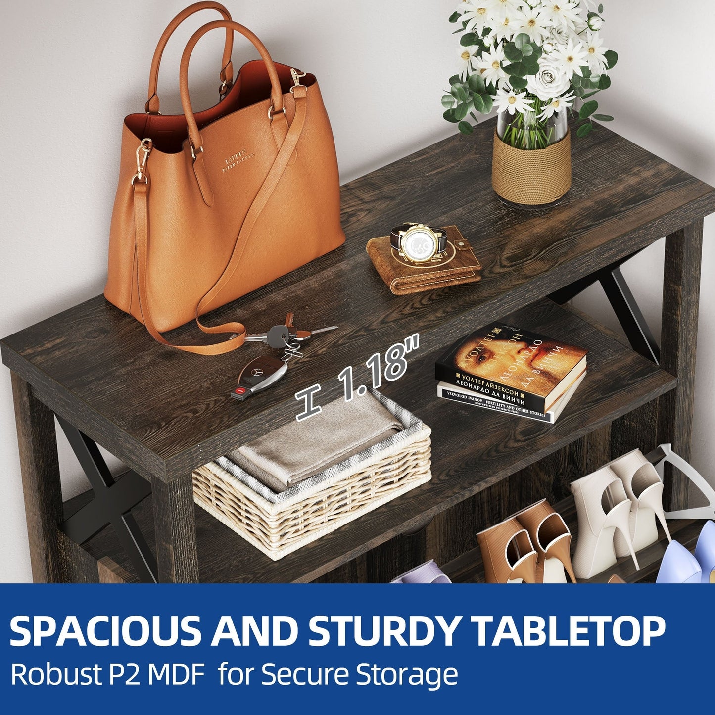 - Le rangement supérieur et le compartiment ouvert offrent un accès facile aux essentiels du quotidien.