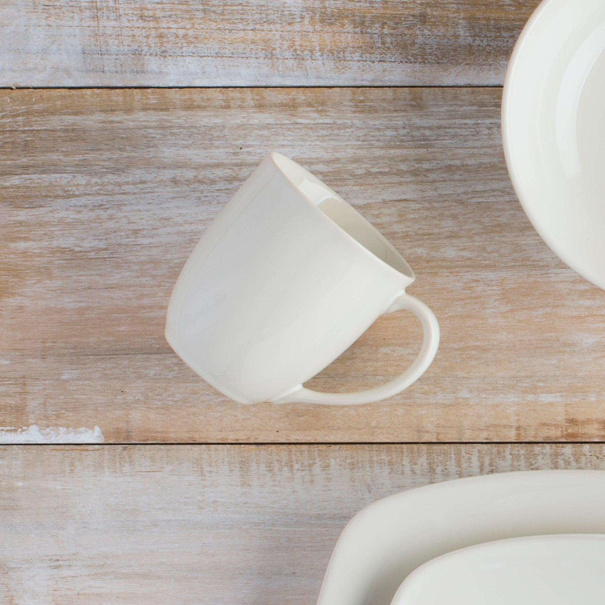 - L'ensemble comprend 4 assiettes plates, des assiettes à salade, des bols à céréales et des tasses